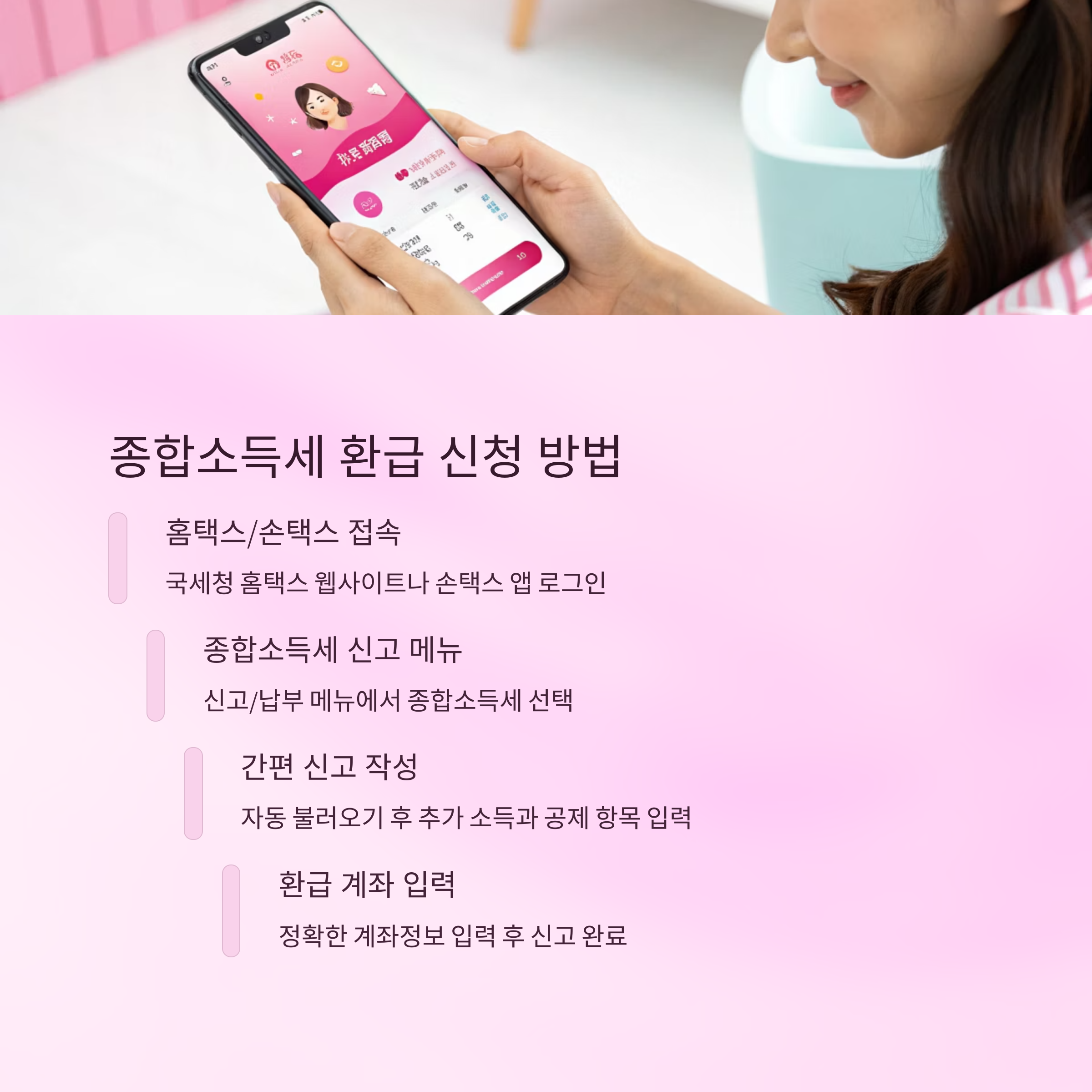 종합소득세 환급은 연말정산 또는 5월 정기 종합소득세 신고 과정에서 이미 납부한 세금이 실제로 납부해야 할 세금보다 많을 경우 차액을 돌려받는 제도입니다. 프리랜서, 자영업자, 중간예납을 한 사업자, 추가 소득이 있는 직장인 등이 주요 환급 대상이며, 홈택스와 손택스 앱을 통해 간편하게 신청할 수 있습니다.