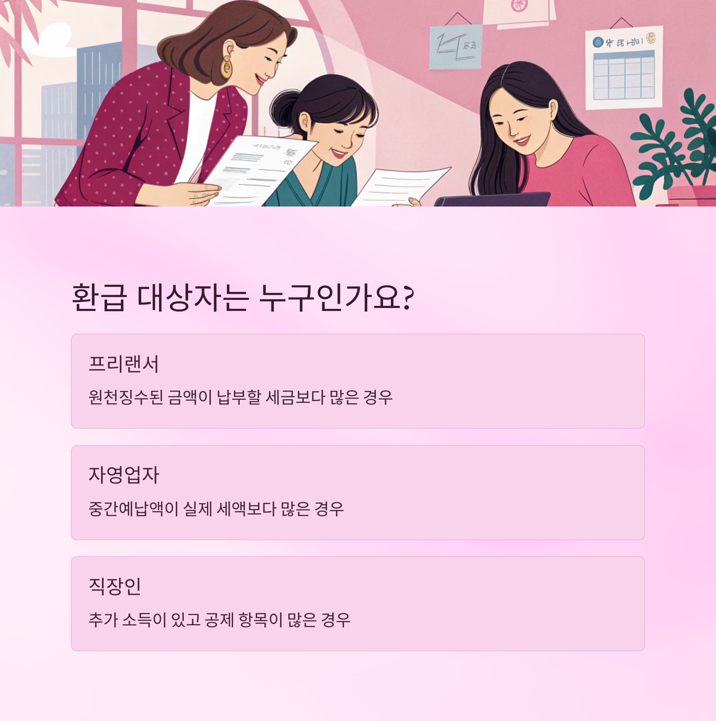A. 미리 낸 세금이 실제 납부 세금보다 많을 경우 환급 대상이 됩니다. 사업자, 프리랜서, 추가 소득이 있는 직장인이 해당됩니다.
