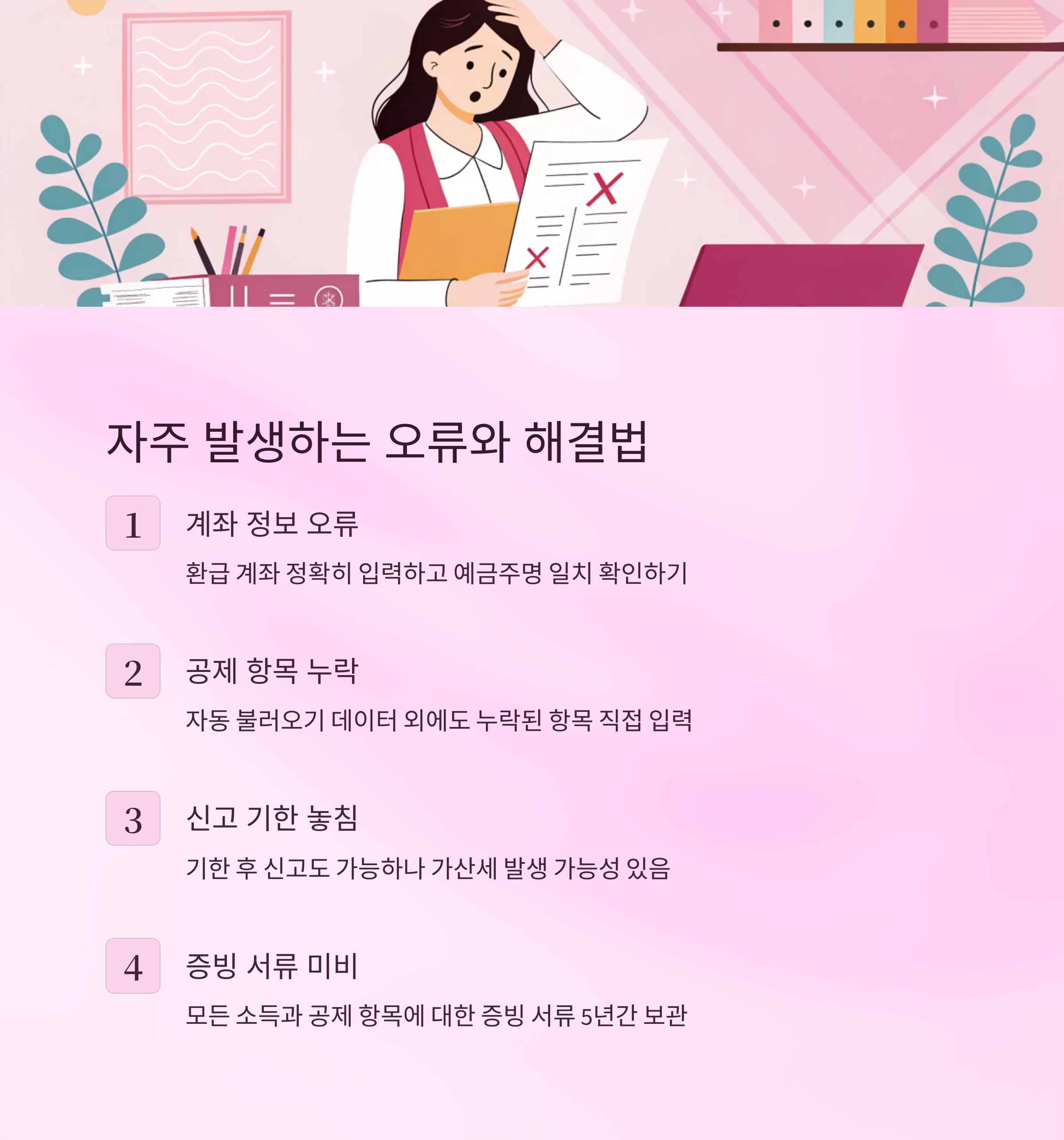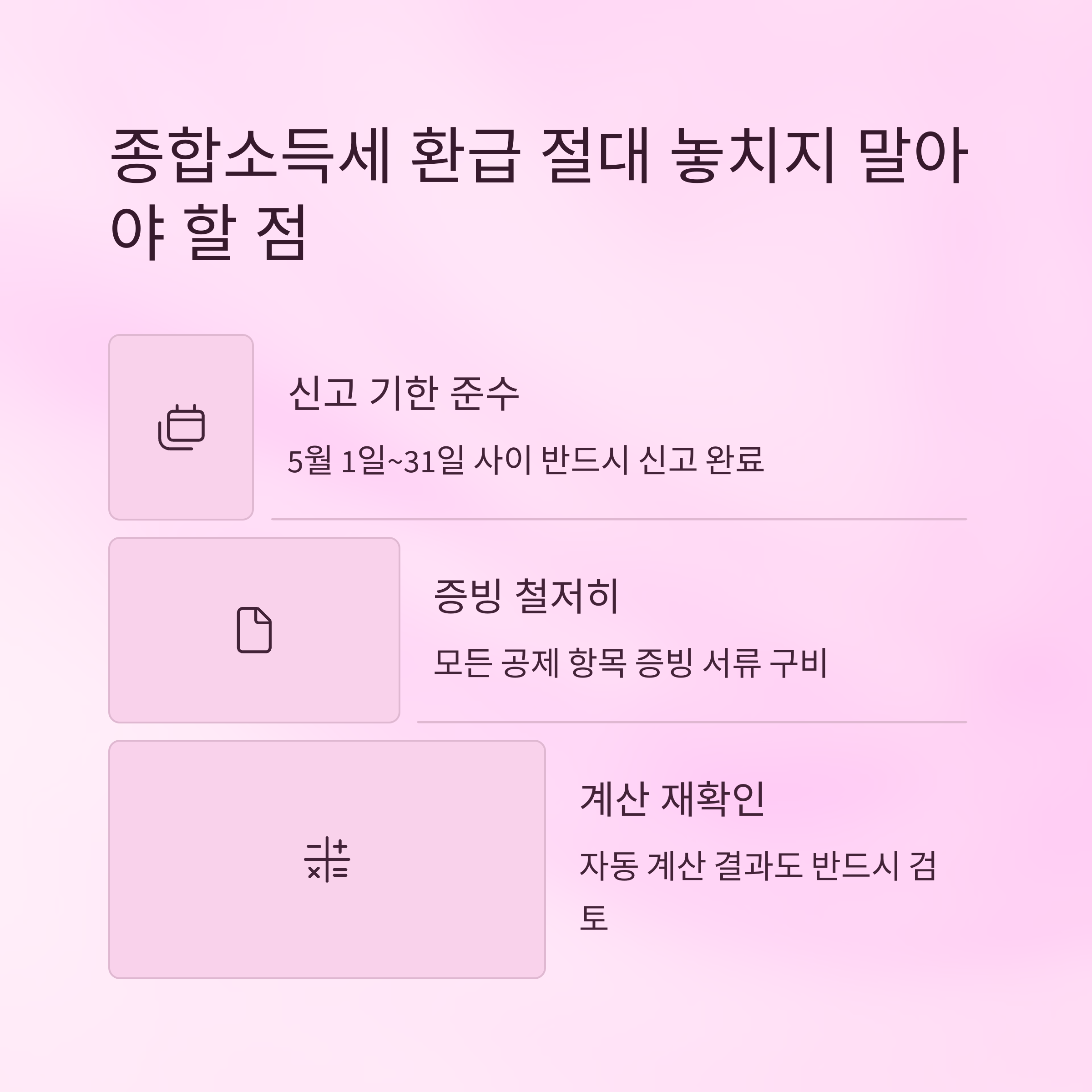 더불어 경비처리와 공제 항목을 꼼꼼히 챙긴다면 생각보다 훨씬 큰 환급액을 받을 수 있으며, 이는 연간 재무계획에도 큰 도움이 됩니다. 이번 기회에 종합소득세 환급을 제대로 챙겨 보세요.