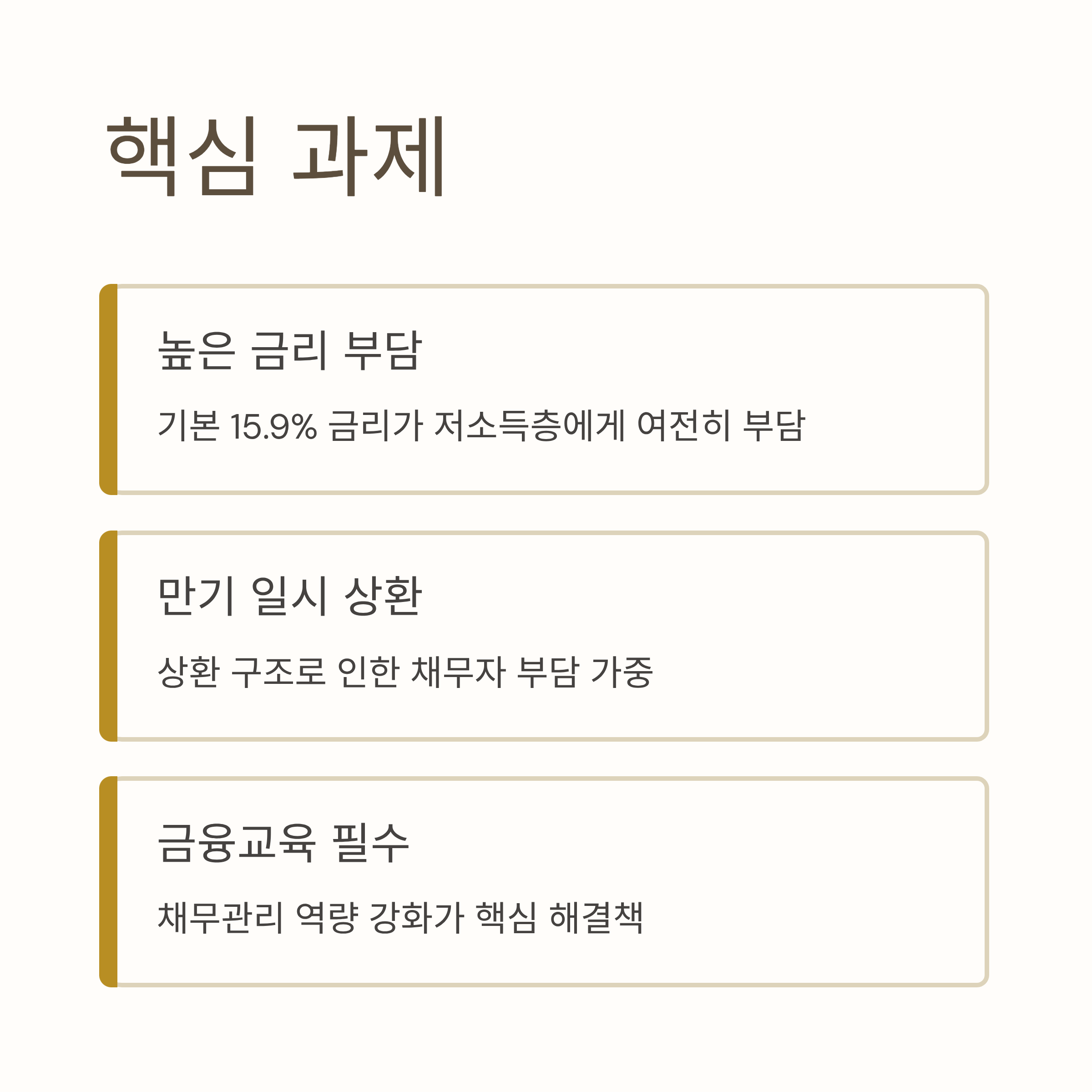 - 높은 금리와 만기 일시 상환 구조로 인해 상환 부담이 크며, 금융교육을 통한 채무관리 역량 강화가 핵심 과제로 대두됩니다.
