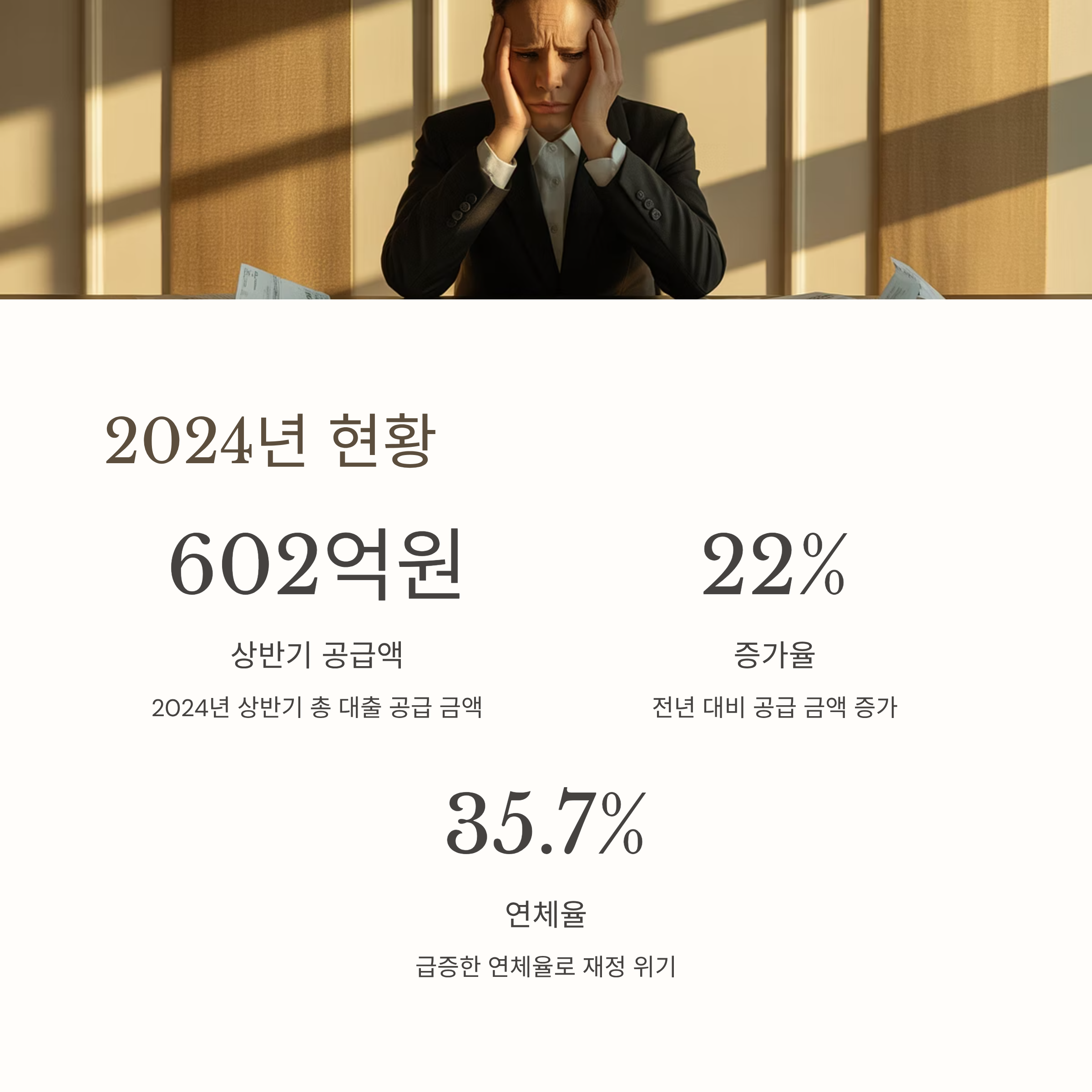 - 공급 금액은 2024년 상반기 602억원으로 전년 대비 22% 증가하였으나, 연체율은 35.7%로 급증하며 재정 안정성이 도마 위에 올랐습니다.