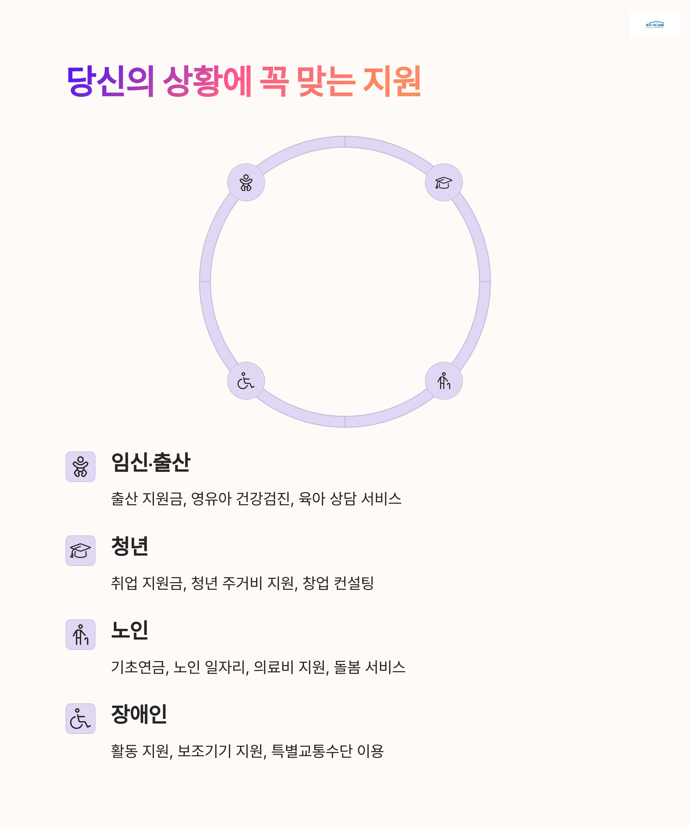 - 임신·출산, 육아, 교육, 노령, 장애 등 생애주기별 복지 항목 안내