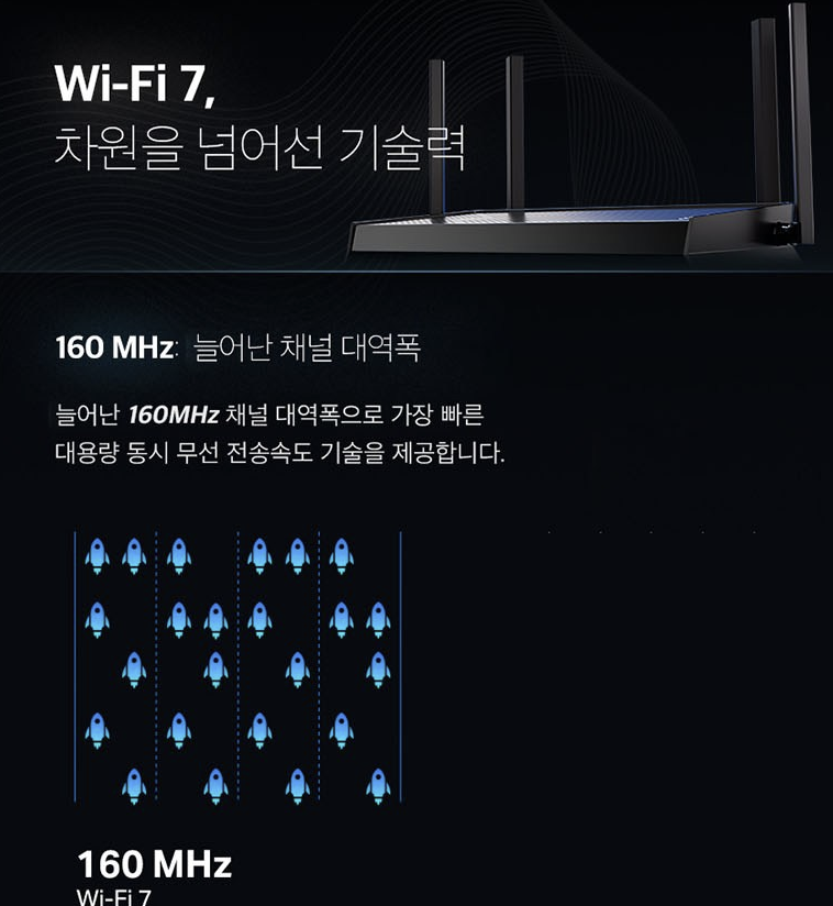 - 무선: 듀얼밴드 Wi-Fi 7 (5GHz 최대 약 2882Mbps + 2.4GHz 약 688Mbps), 4안테나, OFDMA, MU-MIMO, 빔포밍.