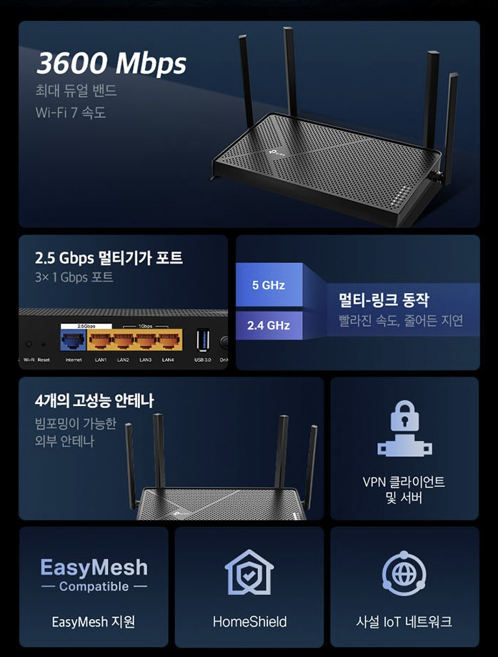 - 특징: EasyMesh 지원, MLO(멀티링크) 준비, 직관적 앱(Tether)·웹 설정, 안정적 기본기.