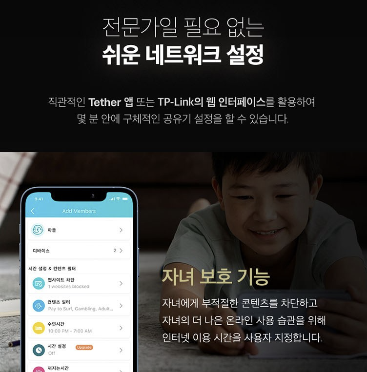 TP-Link Tether 앱과 웹 관리 페이지는 초보자도 쉽게 다룰 수 있는 구조입니다. 게스트 Wi-Fi, QoS, 스케줄링, 보안 옵션을 빠르게 설정할 수 있고, 펌웨어 업데이트도 간단합니다. 단독 커버리지에 아쉬움이 생기면 EasyMesh로 위성 유닛을 추가해 단계적으로 확장할 수 있어, 이사·구조 변경에도 유연하게 대응 가능합니다. MLO는 듀얼밴드 한계로 체감 폭이 크지 않지만, 추후 단말·펌웨어 성숙도에 따라 안정성이 더 좋아질 여지가 있습니다.